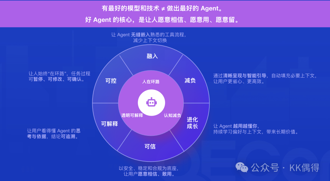 - Agent 应把信任作为目标,而非追求完全自主。 设计的核心不是替代人,而是通过透明与可控的体验,让用户敢于把后背交给 AI。