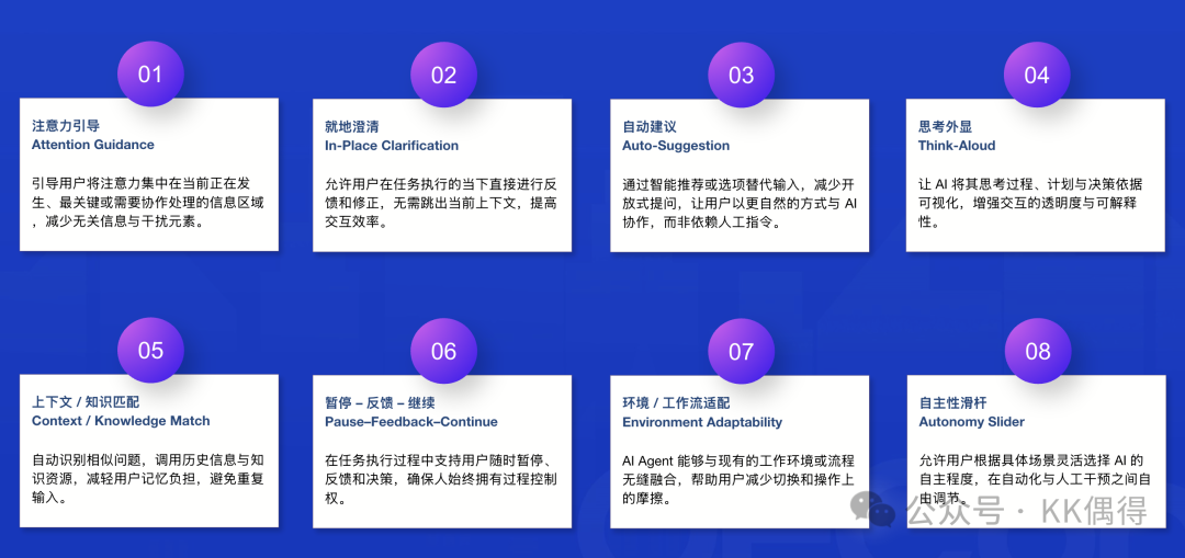 优秀的Agent 产品快速迭代演进。从这些快速演进的产品中,我们看到了 8 个常用的交互设计模式:注意力引导、就地澄清、自动建议、思考外显、上下文/知识匹配、暂停-反馈-继续、环境/工作流适配、自主性滑竿。