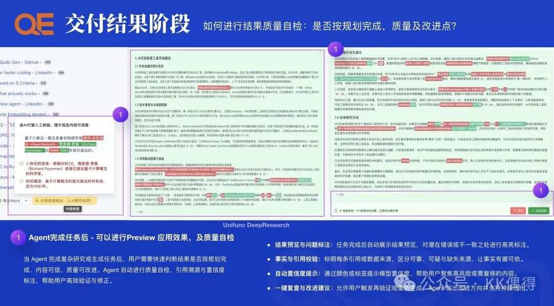 - 案例:Unifunc DeepResearch Agent 生成的报告或代码,必须经过自检。Unifunc 会在报告中标注每一处引用的来源,甚至对潜在的幻觉(如人物名称混淆、时间错误)进行高亮预警,提示用户“此处置信度低,请人工核验”。这种坦诚展示不确定性的设计,反而增加了产品的可信度。