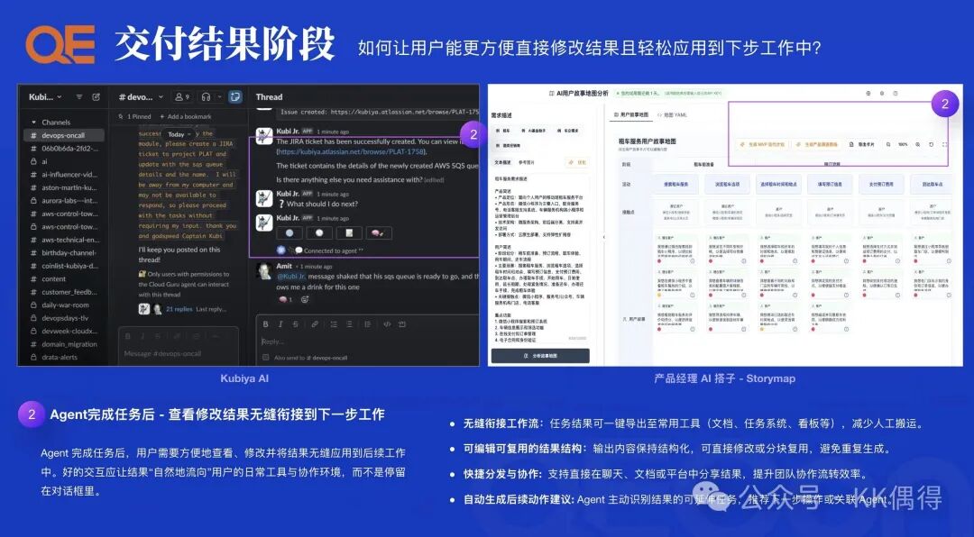 - 案例:Kubiya AI / Product Storymap 对话框不应该是工作的终点。Kubiya 在排查完问题后,会主动建议:“需要我为此创建一个 Jira Ticket 吗?”并直接生成链接。Product Storymap 生成的用户故事地图可以一键导出为 MVP 迭代计划。这体现了环境/工作流适配模式,让结果自然流转。