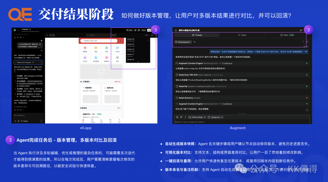 - 案例:v0.app / Augment 用户往往需要多次尝试才能得到满意结果。这些产品支持版本快照与回滚。用户可以像浏览 Git 历史一样查看 Version 16 和 Version 20 的区别,并一键回退。这让 AI 的产出物真正变成了可维护的工程资产,而不仅仅是一次性的对话记录。