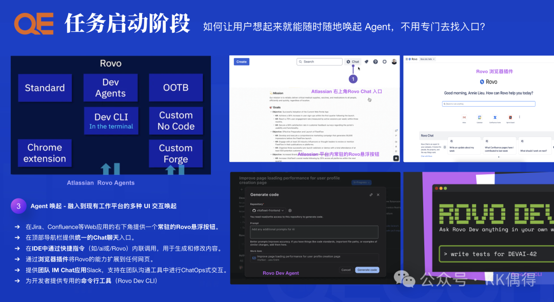 - 案例:Atlassian Rovo Rovo 采用了环境适配(Environment Adaptability) 模式。它不仅仅是一个网页,而是化身为 Jira/Confluence 右下角的常驻悬浮按钮、IDE 中的内联指令、以及覆盖任意页面的浏览器插件。这意味着 Agent 就在手边,用户无需离开当前工作流,极大地减少了切换成本。