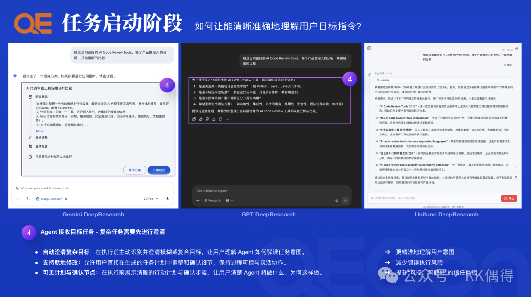 - 案例:Gemini / ChatGPT / Unifunc DeepResearch 当用户指令模糊(如“调研代码审查工具”)时,比如 Gemini 和 ChatGPT Agent 不会盲目执行,而是采用就地澄清(In-Place Clarification) 模式。它会生成一个“研究方案”或提出具体问题(“关注哪种语言?预算多少?”),请求用户确认。这种交互确保了 Agent 在开跑前与用户达成共识,避免了“做多错多”。而另外一个 Unifuncs DeepResearch 则会直接执行,当用户发现错了就只能强行停止。