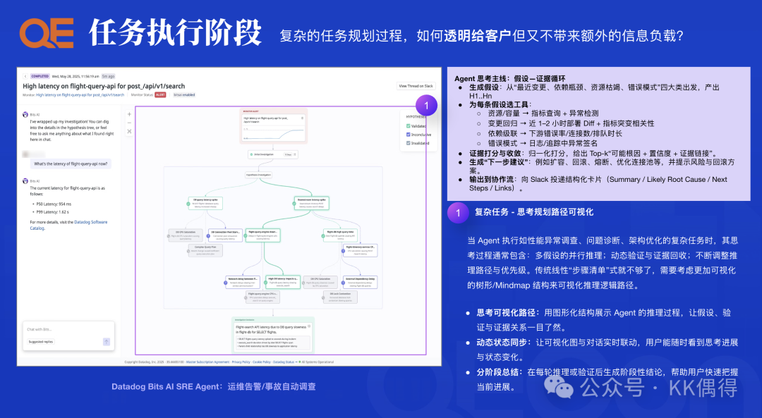 - 案例:Datadog Bits AI 在处理“运维告警调查”这种高认知负载任务时,Datadog 没有扔出一堆日志,而是应用了思考外显(Think-Aloud) 模式。它展示了一个图形化的“假设树”:从资源枯竭、依赖瓶颈等角度生成假设,并实时展示每一条假设的验证状态。这种树形结构让用户一眼就能看懂 AI 的推理逻辑,实现了透明度与信息密度的完美平衡。