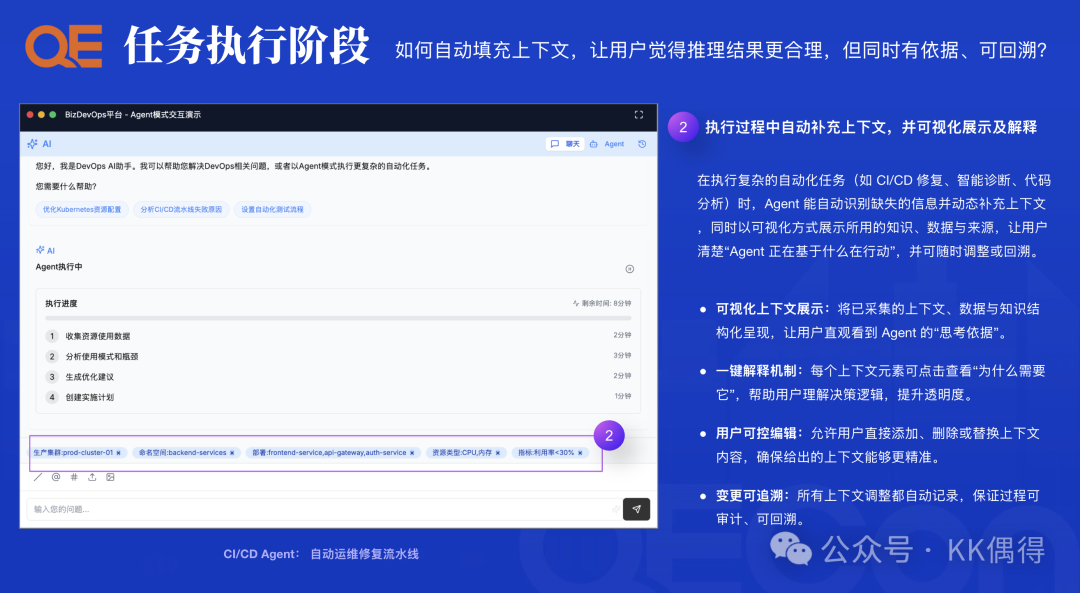 - 案例:CICDAgent / Augment Augment 会在执行中自动匹配上下文(Context Match),并可视化展示它正在读取哪些文件或文档。用户如果发现它读错了文件,可以立即干预修正,确保推理的准确性。我们自己设计的一个 CICD Agent 也参考类类似的设计。