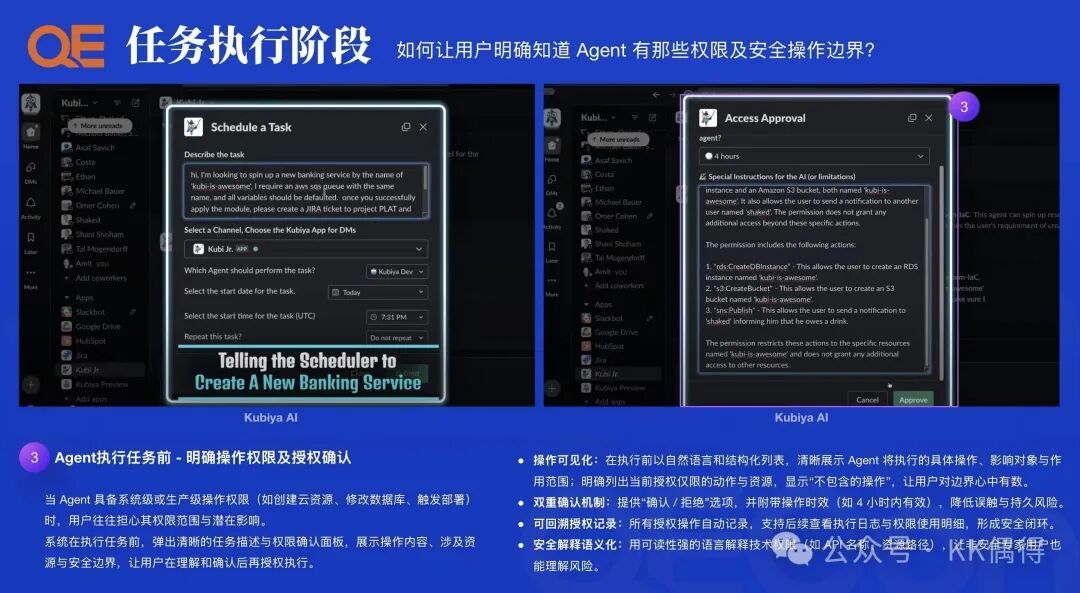 - 案例:Kubiya AI Kubiya 在执行敏感操作(如创建 AWS 资源)前,会弹出一个清晰的权限确认面板。它明确列出:Agent 将执行什么操作、涉及哪些资源、以及(最关键的)“不包含哪些操作”。只有用户点击 Approve 后,Agent 才会获得临时的、一次性的执行权。这解决了用户对“黑盒操作”的恐惧。