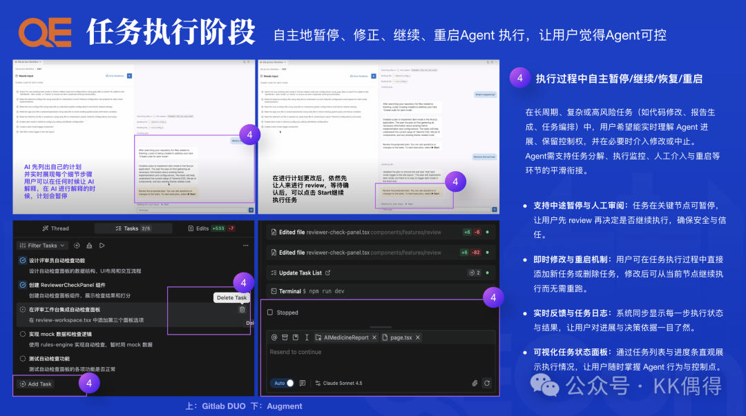 - 案例:GitLab Duo Workflow 和 Augment 该产品支持暂停-反馈-继续(Pause-Feedback-Continue) 模式。Agent 会先列出执行计划,用户可以在执行前增加新步骤或删除多余步骤,或者在执行中途暂停 Agent,查看生成的中间代码。如果发现跑偏,用户可以修改指令后让 Agent 从当前节点“重启”或“继续”,而无需从头再来。